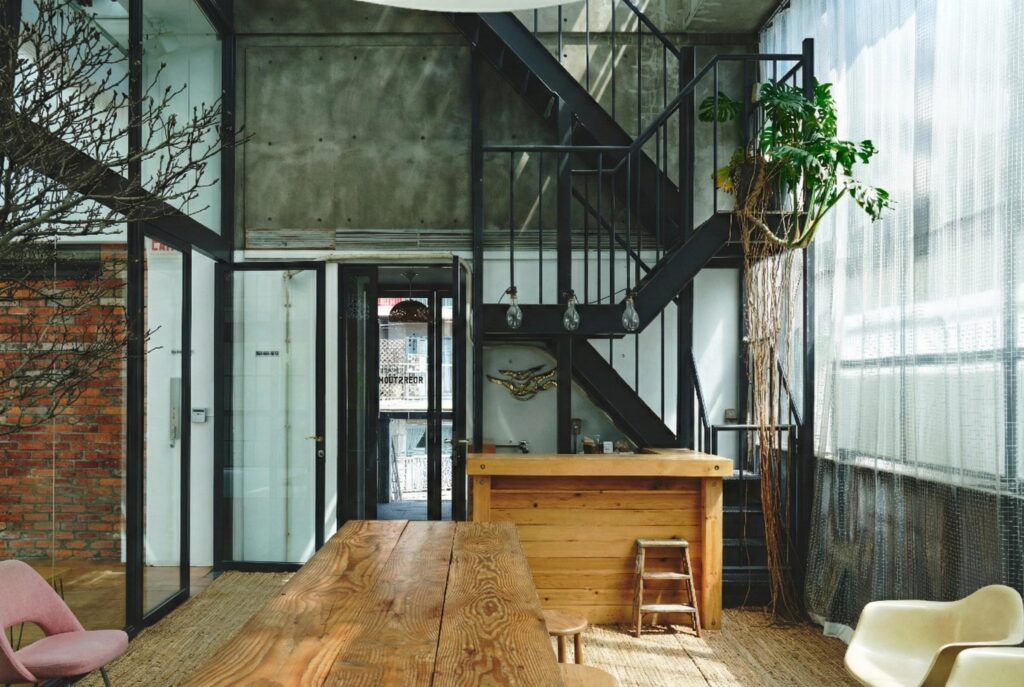 7mの高天井、ブラックフレームのスチールサッシュにレンガ壁といった具合に、